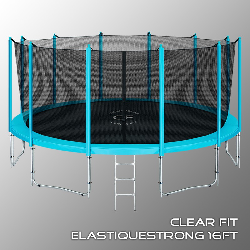 Батуты Clear Fit серии ElastiqueStrong — это современные батуты из качественных комплектующих. Каркас батутов размеров 14 и 16 футов выполнен из усиленных труб диаметром 42 мм, кронштейны используются большей прочности, толщиной 2,05 мм, пружины длиной 165 мм. В комплект размера 16 футов входят батут с прыжковой поверхностью 4,2 м, защитная сеть на усиленных стойках полной длины (от верхней точки защитной сети до земли) и лестница, что делает батут безопасным, устойчивым, исключает падение и складывание каркаса. Качественные материалы и мощная рама предусматривают эксплуатацию батута 16ft пользователями до 200 кг. Дополнительно данная модель позволяет установить баскетбольный щит, комплект BasketStrong (щит, кольцо с сеткой, мяч, насос) можно приобрести отдельно. Батуты ElastiqueStrong это прекрасная аэробная нагрузка - улучшения общей физической формы, заряд положительными эмоциями, улучшение работы кардиоваскулярной системы, укрепление вестибулярного аппарата, развитие чувства равновесия и координации в пространстве для пользователей любого возраста. Именно поэтому мы используем только высококачественные комплектующие с большим запасом прочности. В большинстве случаев батуты данного типа устанавливаются под открытым небом, обязательные требования к материалам — это влагостойкость, термоустойчивость, в том числе и к низким температурам, переносимость ультрафиолетовых лучей и износостойкость. Занятия на свежем воздухе укрепляют иммунитет, снабжают организм кислородом, повышают выносливость как у детей, так и у взрослых. Конструкция для обеспечения безопасности выполнена из нержавеющей стали Q195, диаметр стальных труб W - опор и каркаса 42 мм. Каркас из труб толщиной 1,5 мм соединяется с помощью мощных сварных Т-образных кронштейнов из металла толщиной 2,05 мм и высококачественных гальванизированных метизов, усиленных резьбовых скоб с мягким уплотнением. Прыжковое полотно — это основной элемент батута. Материал прыжкового полотна Перматрон (Permatron) — эластичный материал, способный возвращаться в исходное состояние при постоянном воздействии с разным усилием. Термообработка волокон материала обеспечивает высокую прочность на разрыв и стрессоустойчивость материала. Это влагостойкий, эластичный термоустойчивый материал с низким коэффициентом усталости, не поддается распаду от ультрафиолета. Пружины выполнены из гальванизированной стали толщиной 3,1 мм, устойчивы к коррозии и долговечны, длина пружин 165 мм. Для диаметра батута 16 футов используется 108 шт., что, обеспечивает оптимальную амплитуду и безопасность, с учетом веса пользователя до 200 кг. Пружинный механизм оснащен мягким многослойным защитным матом – внутренний мягкий амортизирующий слой EPE толщиной 20 мм, далее термостойкий слой (PE) и внешний слой износостойкого негорючего поливинилхлорида (PVC), прочный, яркий, всепогодный, влагостойкий. Двойная защитная сеть входит в обязательную комплектацию батутов. Защита устанавливается только с внутренним креплением, что не уменьшает рабочую поверхность батута, но полностью исключает соприкосновение с пружинным механизмом. Материал защитной сети из 100% Polyethylene, основные свойства — это прочность, эластичность, низкая адгезия, морозостойкость, амортизация (нечувствителен к ударам), рабочая температура -40 C° ... 80 C°, устойчив к ультрафиолету. Вход на у