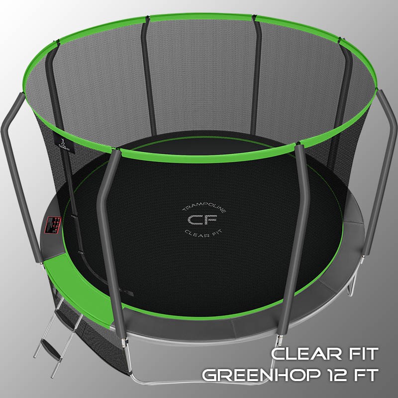 В 2026 году представлена обновленная линейка с улучшенной конструкцией каркаса. Усиление достигнуто за счет использования прочных Т-образных кронштейнов из металла толщиной 1.9 мм. Кроме того, в комплектацию добавлен карман для обуви. Каркасный батут с защитной сеткой Clear Fit серии GreenHop — отличаются комфортом и надежностью. Надежная рама из качественных комплектующих, прочная защитная сеть снабжена прямым креплением к прыжковому полотну и дополнительной защитой входа, наверху каркасное жесткое крепление, сеть не провисает и не слетает во время тренировок. Увлекательный, полезный и безопасный тренажер для всей семьи. Батуты серии GreenHop 10Ft, 12Ft, 14Ft и 16Ft поставляются в оптимальной для комфорта и безопасности комплектации: батут, верхняя защитная сеть, защитный мат, лестница и карман для обуви. Батут размером в 12 футов с прыжковой поверхностью 3.21 м идеально подходит для пользователей любого возраста, размеры полотна позволяют комфортно тренироваться взрослым и развлекаться детям, включая подростков. Верхняя защитная сеть оберегает от падений, усиленная молния и дополнительная защита входа уберегут малышей от случайного входа или падения. Надежный каркас из оцинкованной стали, качественные комплектующие и погодостойкие гальванизированные метизы рамы делает батут безопасным, устойчивым, надежным, гарантируют полную защиту от коррозии и долгий срок службы. Максимальный вес пользователя батута GreenHop 12Ft — до 200 кг.