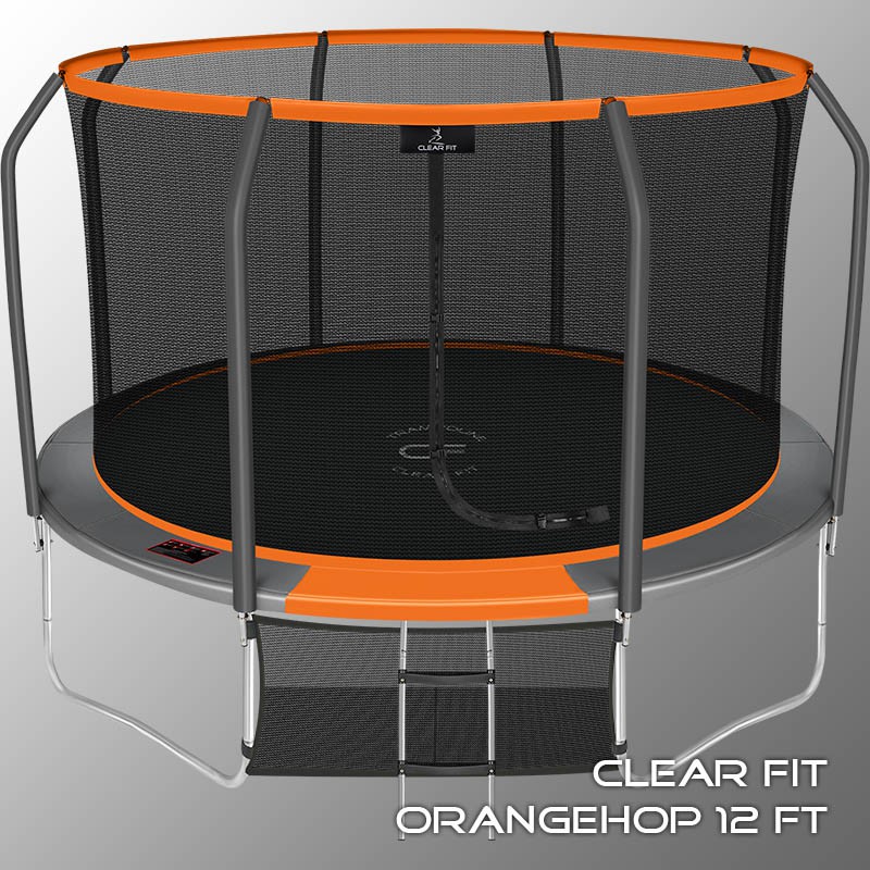В 2026 году представлена обновленная линейка с улучшенной конструкцией каркаса. Усиление достигнуто за счет использования прочных Т-образных кронштейнов из металла толщиной 1.9 мм. Кроме того, в комплектацию добавлен карман для обуви. Каркасный батут с защитной сеткой Clear Fit серии OrangeHop — отличаются комфортом и надежностью. Надежная рама из качественных комплектующих, прочная защитная сеть снабжена прямым креплением к прыжковому полотну и дополнительной защитой входа, наверху каркасное жесткое крепление, сеть не провисает и не слетает во время тренировок. Увлекательный, полезный и безопасный тренажер для всей семьи. Батуты серии OrangeHop 10Ft, 12Ft, 14Ft и 16Ft поставляются в оптимальной для комфорта и безопасности комплектации: батут, верхняя защитная сеть, защитный мат, лестница и карман для обуви. Батут размером в 12 футов с прыжковой поверхностью 3.21 м идеально подходит для пользователей любого возраста, размеры полотна позволяют комфортно тренироваться взрослым и развлекаться детям, включая подростков. Верхняя защитная сеть оберегает от падений, усиленная молния и дополнительная защита входа уберегут малышей от случайного входа или падения. Надежный каркас из оцинкованной стали, качественные комплектующие и погодостойкие гальванизированные метизы рамы делает батут безопасным, устойчивым, надежным, гарантируют полную защиту от коррозии и долгий срок службы. Максимальный вес пользователя батута OrangeHop 12Ft — до 200 кг.