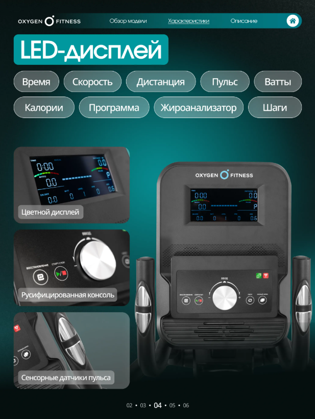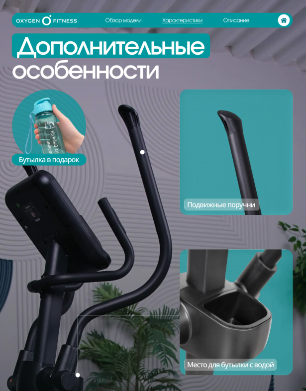 OXYGEN FITNESS SONOMA — современный эллиптический тренажёр для домашних кардиотренировок, сочетающий плавную биомеханику, электронную систему нагружения и расширенные цифровые возможности. Модель подойдёт для пользователей, которые хотят тренироваться регулярно, контролировать нагрузку и использовать интерактивные форматы занятий без перегрузки суставов. Тренажёр построен на высокопрочной раме с антикоррозийной обработкой и двухслойной покраской, что обеспечивает устойчивость и долговечность конструкции. Корпус выполнен из ударопрочного полистирола HIPS, устойчивого к механическим нагрузкам и износу. Ключевые параметры движения: • Инерционный вес маховика 24 кг (BioFusion™) при реальном весе 6 кг — ровный и стабильный ход без рывков. • Длина шага 460 мм — комфортная амплитуда движения для пользователей разного уровня подготовки. • Расстояние между педалями 80 мм — устойчивое и безопасное положение ног. • Трёхкомпонентный шатун — повышенная надёжность и ресурс педального узла. Увеличенные антискользящие педали обеспечивают уверенную фиксацию стопы, а двухпозиционные рукоятки позволяют задействовать мышцы верхней части тела. OXYGEN FITNESS SONOMA оснащён электромагнитной системой нагружения с 16 уровнями сопротивления, регулируемыми электронно. Это позволяет точно подбирать интенсивность тренировки и плавно менять нагрузку в процессе занятия. Цветная LED-консоль отображает расширенный набор тренировочных показателей: • время, скорость, дистанцию, • калории и пульс, • программу, Ватты, • жироанализатор и количество шагов. Программный пакет включает 20 режимов тренировок: • быстрый старт и ручной режим, • 10 предустановленных программ, • 4 пульсозависимые программы, • 4 пользовательские программы, • режим работы по Ваттам и жироанализатор. Для более точного контроля пульса предусмотрены сенсорные датчики на поручнях, а также возможность подключения Bluetooth-кардиодатчика (приобретается отдельно). Тренажёр поддерживает Bluetooth-подключение к популярным приложениям Kinomap™ и Zwift™ с интерактивным уровнем интеграции, что делает тренировки более вовлекающими и разнообразными. Дополнительные элементы комфорта: • подставка под планшет или смартфон, • подставка для бутылки, • удлинённый сетевой шнур 4 м, • транспортировочные ролики и компенсаторы неровностей пола. Интерфейс доступен на русском и английском языках. Тренажёр работает от сети 220 В и рассчитан на пользователей весом до 150 кг. OXYGEN FITNESS SONOMA — сбалансированный эллиптический тренажёр для дома, который объединяет комфортную биомеханику, современные технологии и функциональность, необходимую для эффективных и разнообразных кардиотренировок.