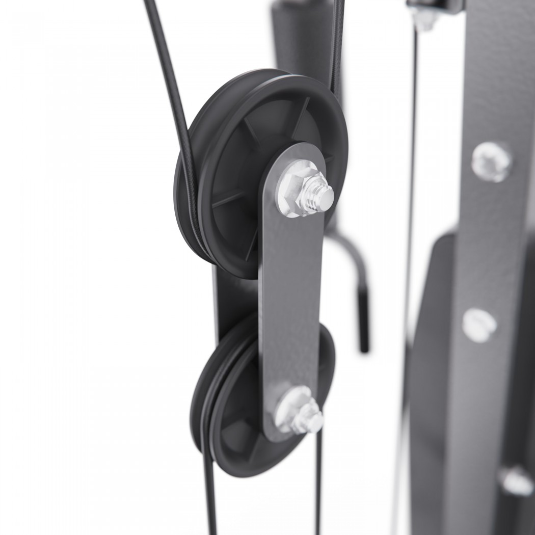 В конструкции предусмотрено 9 свободных блоков и 1 встроенный весовой блок весом 46 кг. Такая система позволяет гибко настраивать нагрузку под уровень подготовки пользователя — от начинающего до уверенного спортсмена. Силовой комплекс удобно использовать как для набора мышечной массы, так и для поддержания формы.