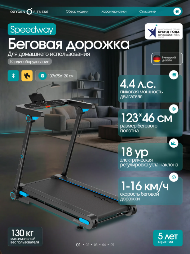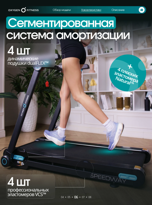 OXYGEN FITNESS SPEEDWAY — функциональная домашняя беговая дорожка с электронным углом наклона, продвинутой амортизацией и интерактивной интеграцией с Kinomap™. Бесщеточный двигатель 2.25 л.с. Fuji Electric (пиковая мощность 4.4 л.с.) обеспечивает стабильную и тихую работу. Скорость от 1 до 16 км/ч подходит для ходьбы, лёгкого и интенсивного бега. Полотно 123 × 46 см и дека 15 мм создают устойчивую и безопасную зону для тренировки. Система амортизации сочетает подушки dualFLEX™, эластомеры Natural™ и VCS™, снижая ударную нагрузку на суставы. 18 уровней наклона позволяют варьировать интенсивность и имитировать подъёмы. Bluetooth и интерактивная интеграция с Kinomap™ автоматически регулируют угол наклона по профилю маршрута. LED-дисплей отображает основные параметры тренировки. 17 программ, сенсорные датчики пульса, управление скоростью и наклоном на поручнях, подставка под планшет, держатель для бутылки. Прочная рама с антикоррозийной обработкой, ударопрочный пластик HIPS. Складная конструкция, транспортировочные ролики. Максимальный вес пользователя — 130 кг. OXYGEN FITNESS SPEEDWAY — технологичное решение для эффективных домашних тренировок с расширенным функционалом и комфортной амортизацией.